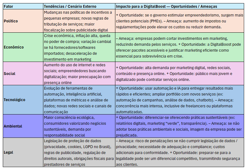 A empresa deve avaliar se o fator analisado favorece o crescimento (oportunidade) ou cria riscos (ameaça). Exemplo: